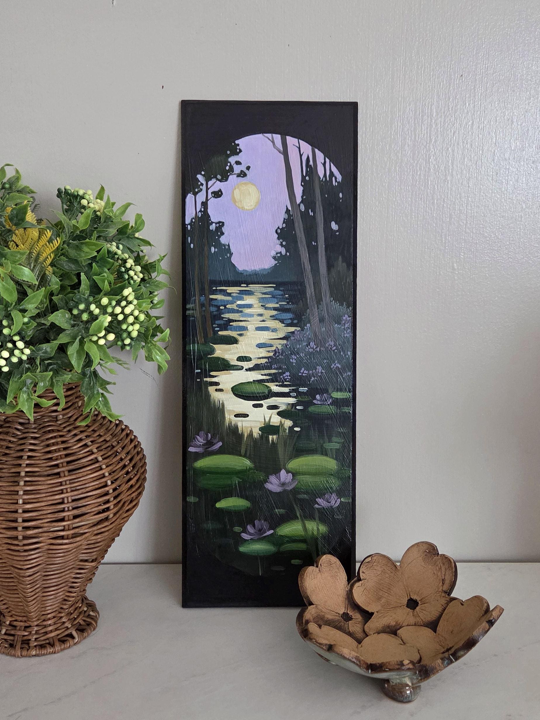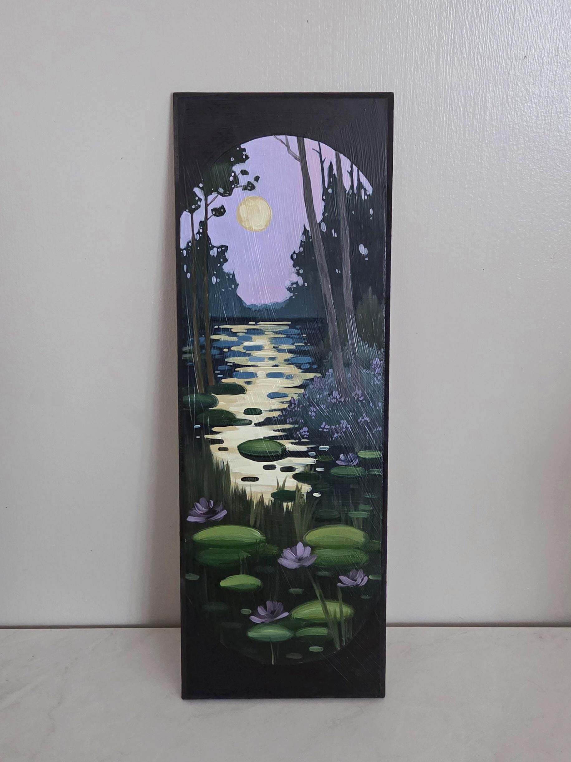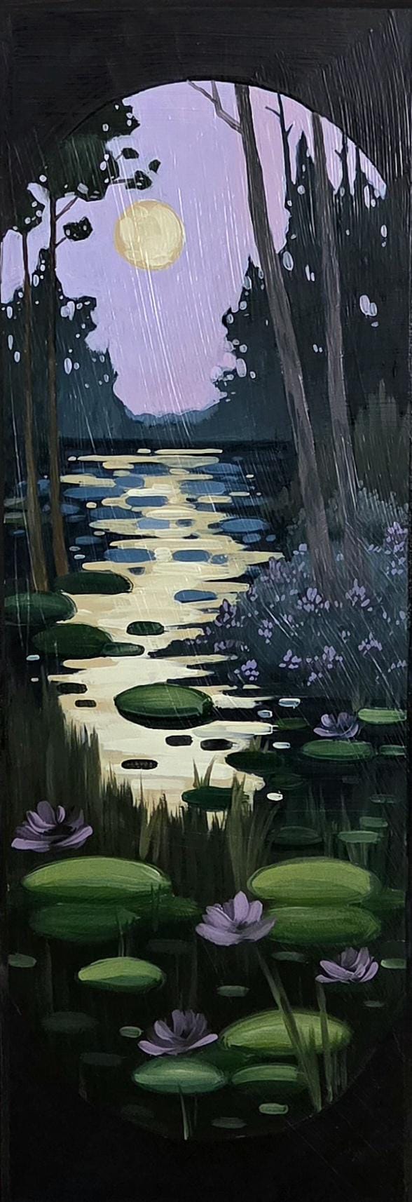 This is an original oil painting of a surreal landscape with purple skies & luscious lily pads.