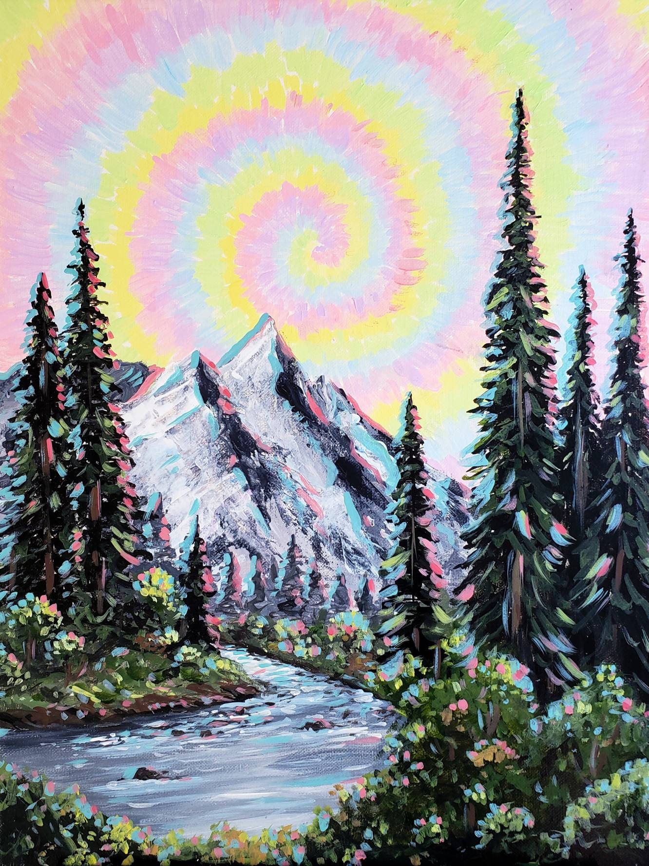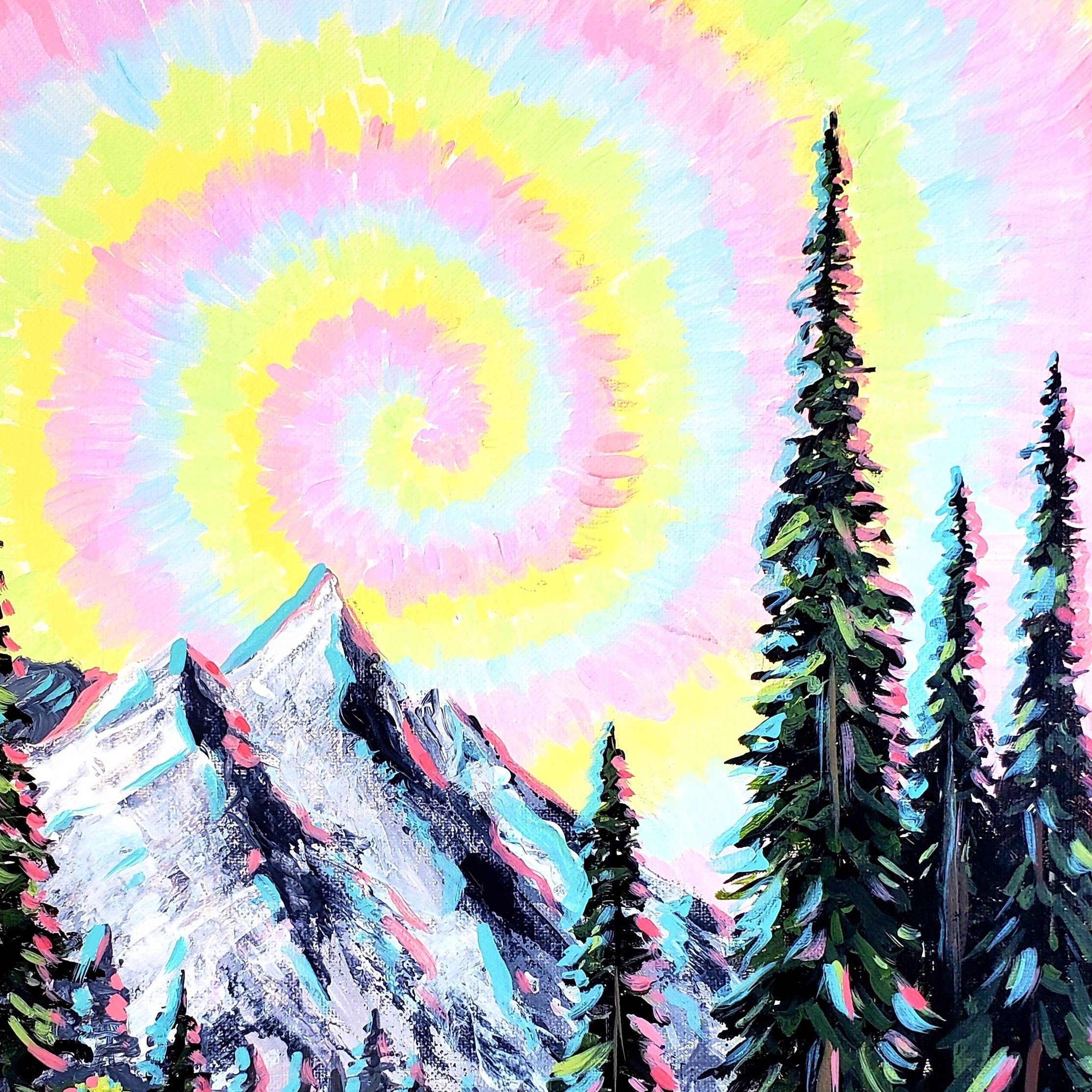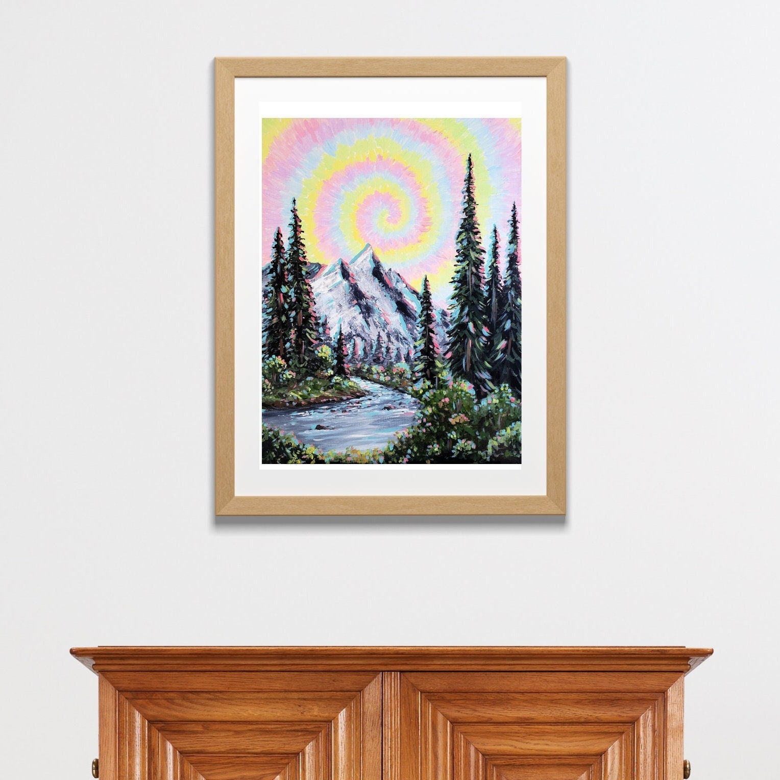 High quality art print of an acrylic painting. Bob Ross inspired landscape; surreal and psychedelic.